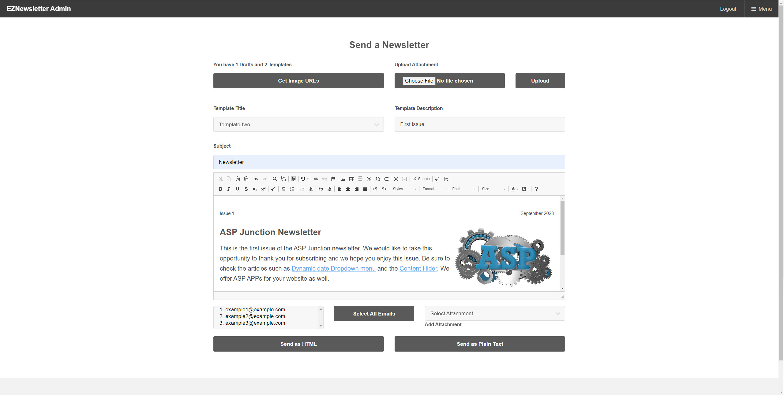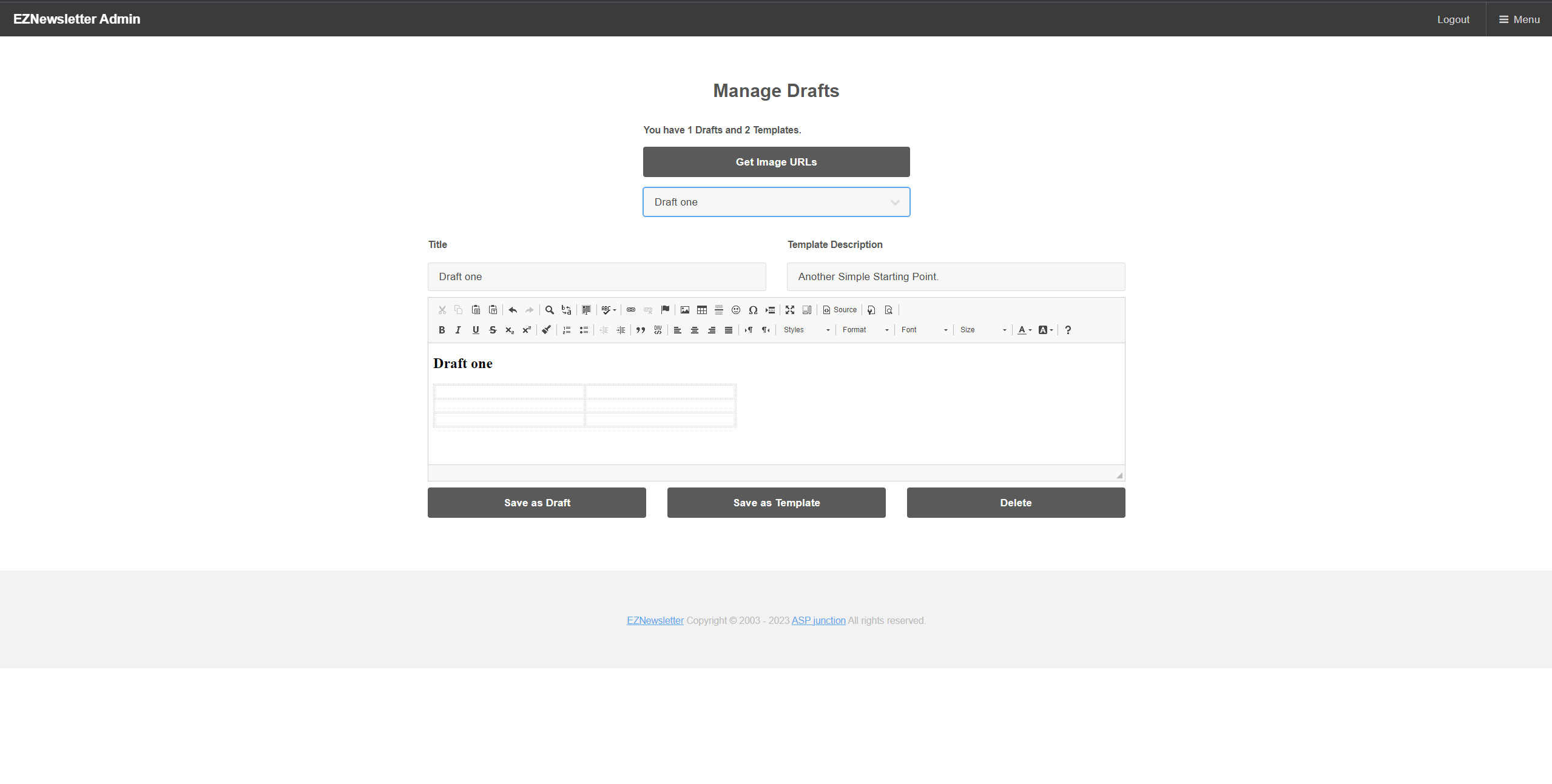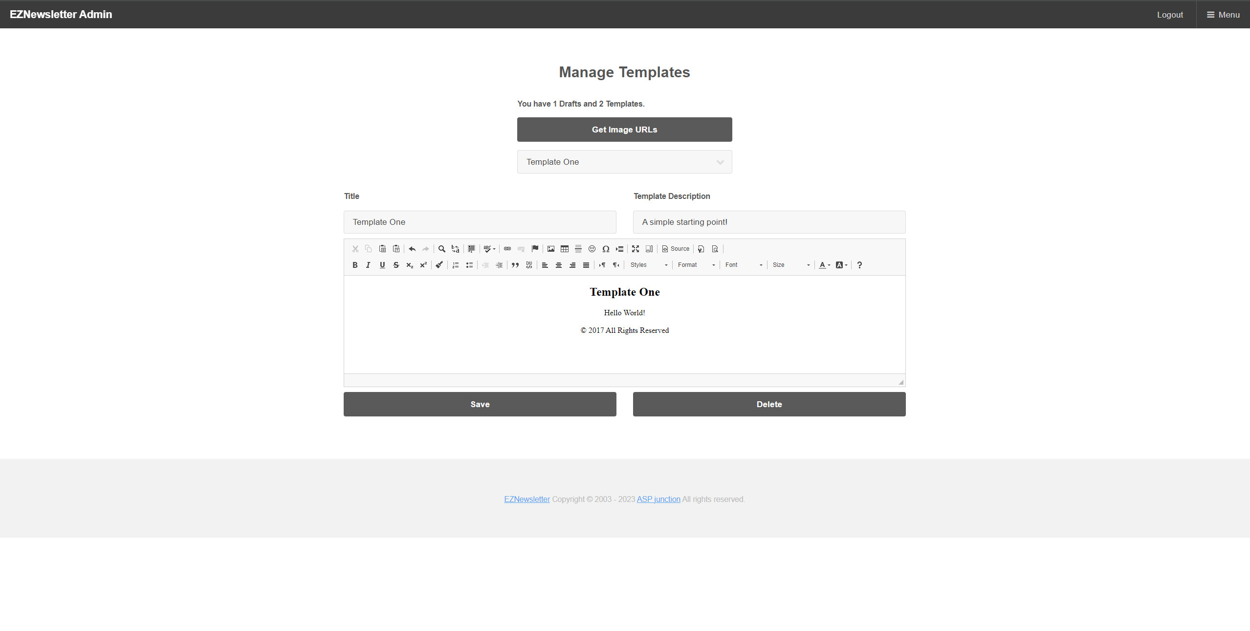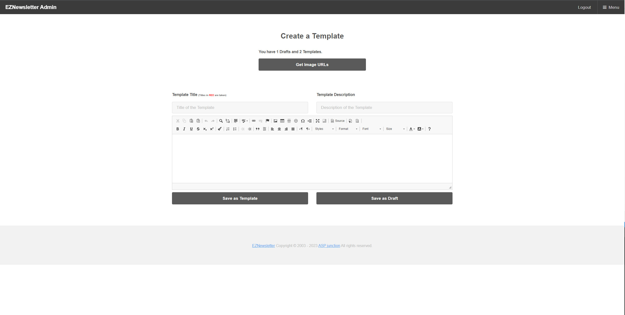 Creating a newsletter template is a snap with CKEditor's WYSIWYG full featured editor. Add links, images, media and more. Select Font styles, sizes, and color as well as the usual Bold, Italic, Underline and all the others. Save as a finished Template or as an unfinished draft. The difference being you can't accidently send a draft. Just because a template is finished doesn't mean you can't edit or delete it! The Manage Template page is were you can update a newsletter(s), again with CKEditors WYSIWYG full featured editor. Change the layout, replace, add images, or change text. If you just don't like the template then you can delete it and start over.