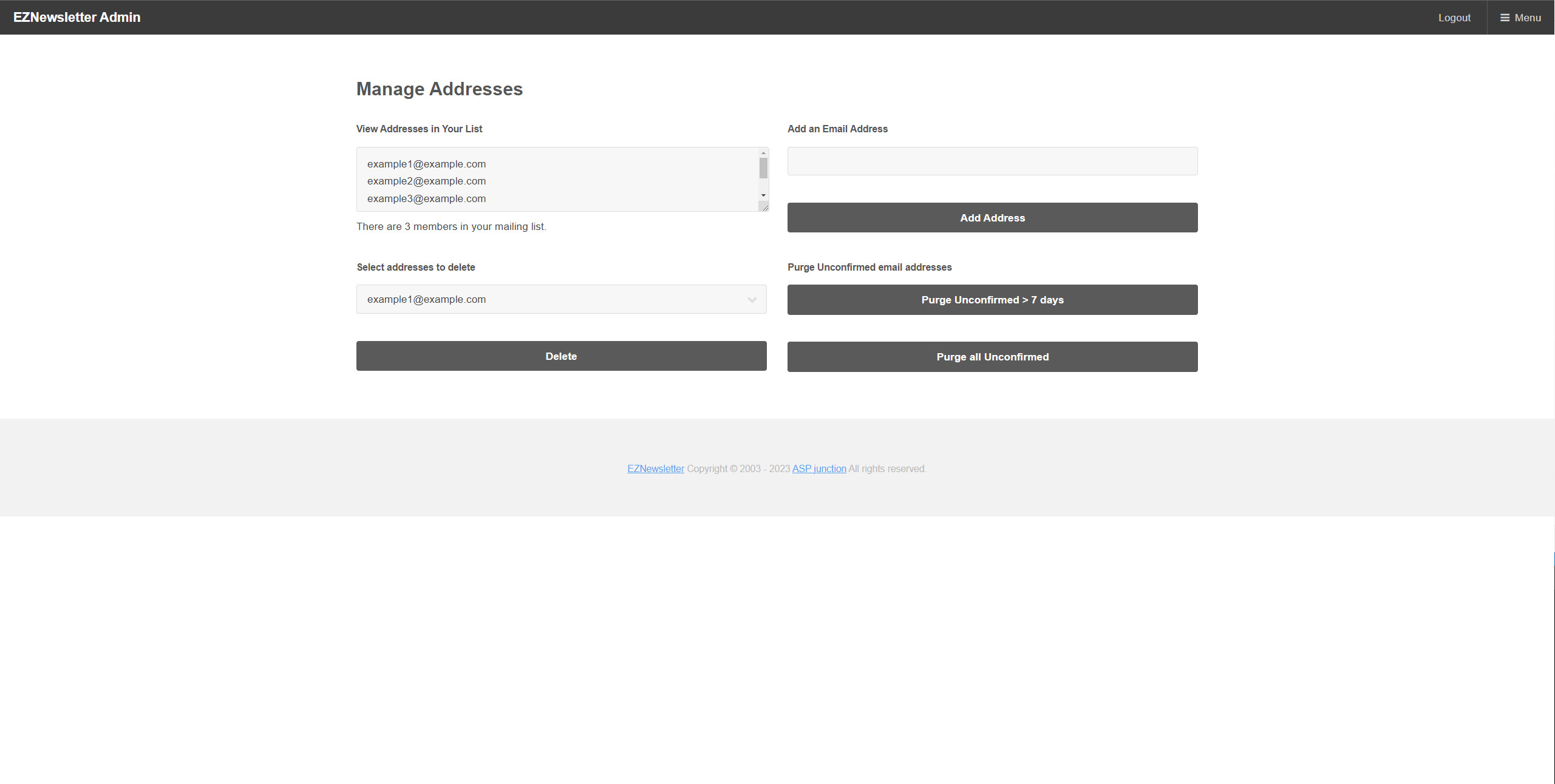 View your mailing list and add addresses to it! Pruge the list of addresses that have not been confirmed within seven days or purge all unconfirmed addesses at once. If a subscriber requests to have their address removed you can do it from here! And last but not least is the Manage Admin page. Add more Administrators and asign them rights, limit them to just editing Templates and Drafts or let them send them also. Give them as much or as little power as you wish.