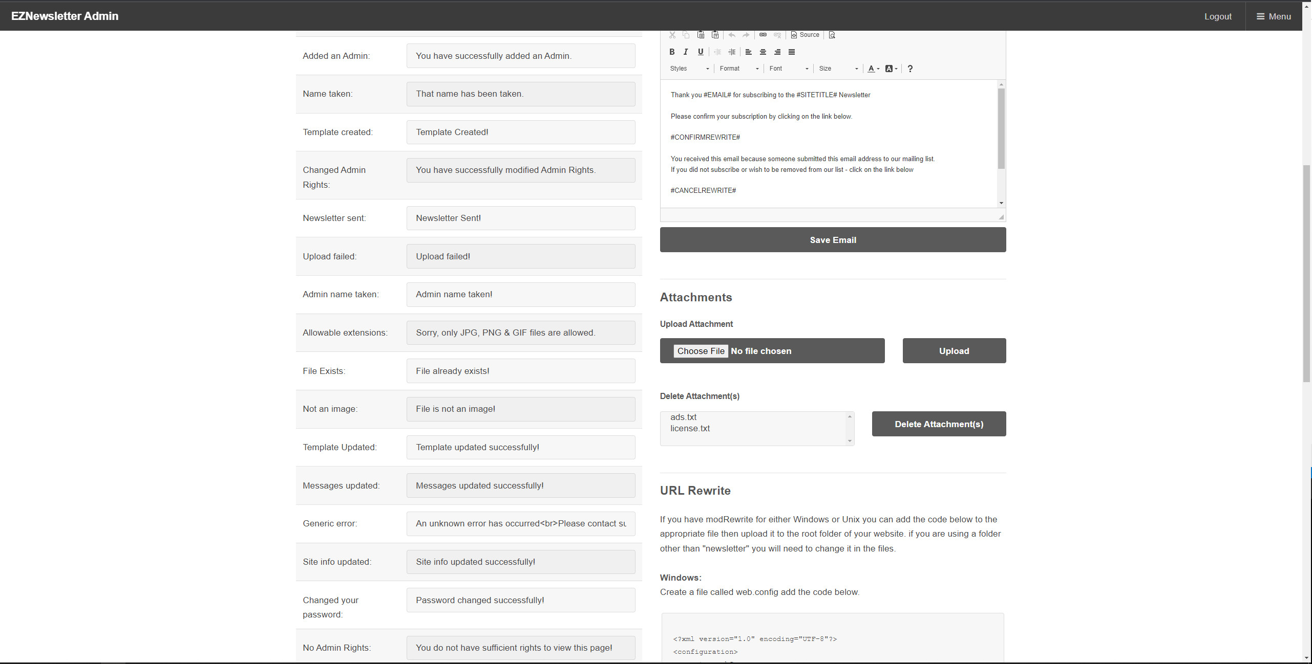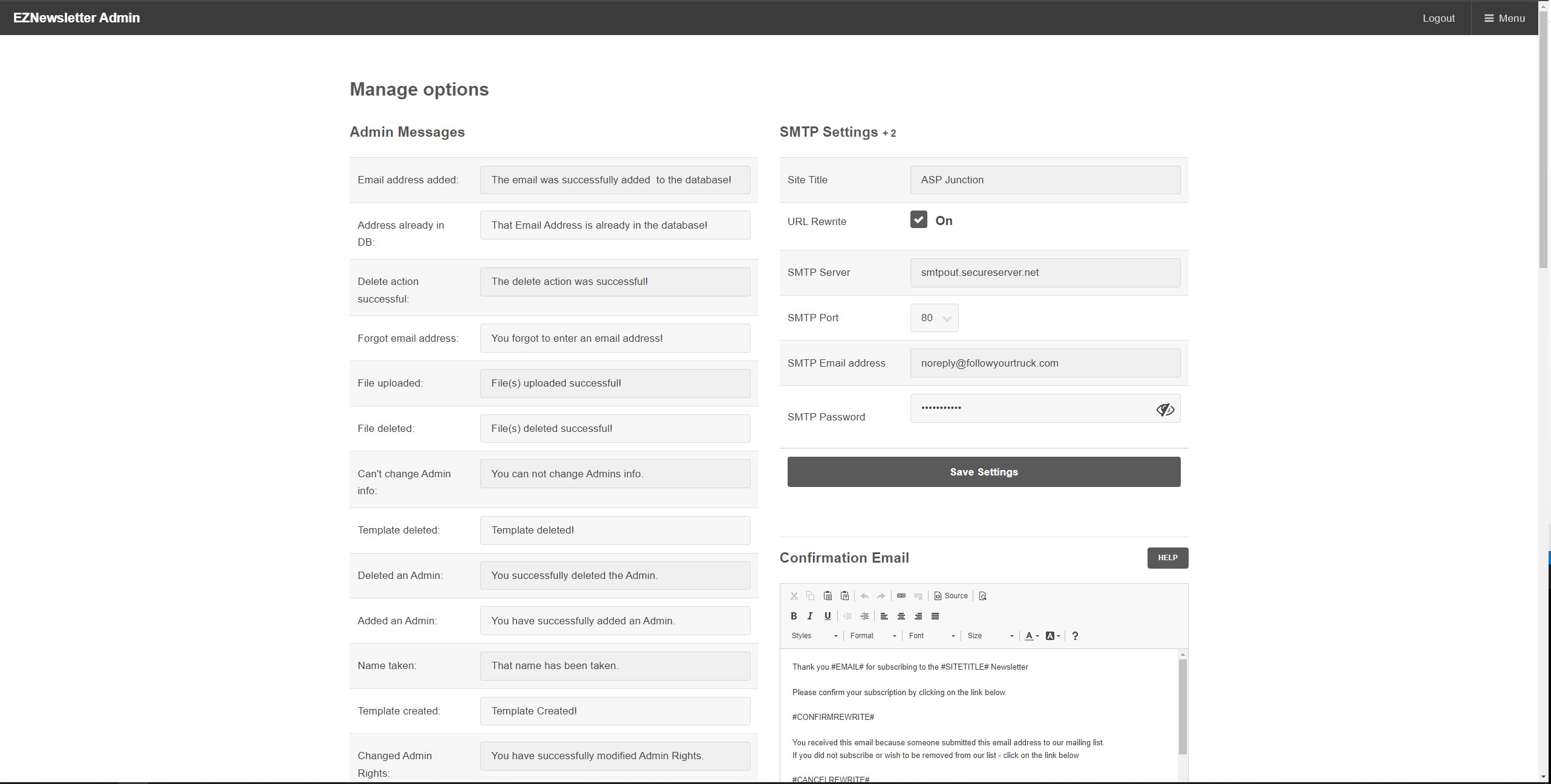 The Manage Options page is where the settings for the APP is. Here you can edit messages and change the SMTP settings enter server information such as server name, port number, and login info. Enable SMTP Debug to see the errors in the output window on the Send Newsletter page. Enable URL Rewrite and use the examples to set it up.